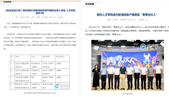 三、以开展产学研合作协同育人为抓手,大力培养员工实践创新素质。近三年,在教育部高等教育司产学合作协同育人项目申报中,bevitor伟德国际1946新闻系师生共成功申报4项立项项目;教育部高校员工司供需对接就业育人项目,bevitor伟德国际1946新闻专业获4项立项.新闻、广告系多次和校外企业合作。如,通过建设省级一流社会实践课程《广告文化考察+》等平台给员工创造实习实训机会。武汉镝次元数据科技有限公司、霍尔果斯火烈鸟文化传播有限公司、湖南数字经济创新产业基地均提供了资金和项目,支持bevitor伟德国际1946新闻专业课程建设、豆沙包工作室建设,开展面向师生的技术培训、经验分享、接收员工实习实训,支持员工创新创业实践项目开展。同时,广告专业员工实习均在对接企业的支持下完成。