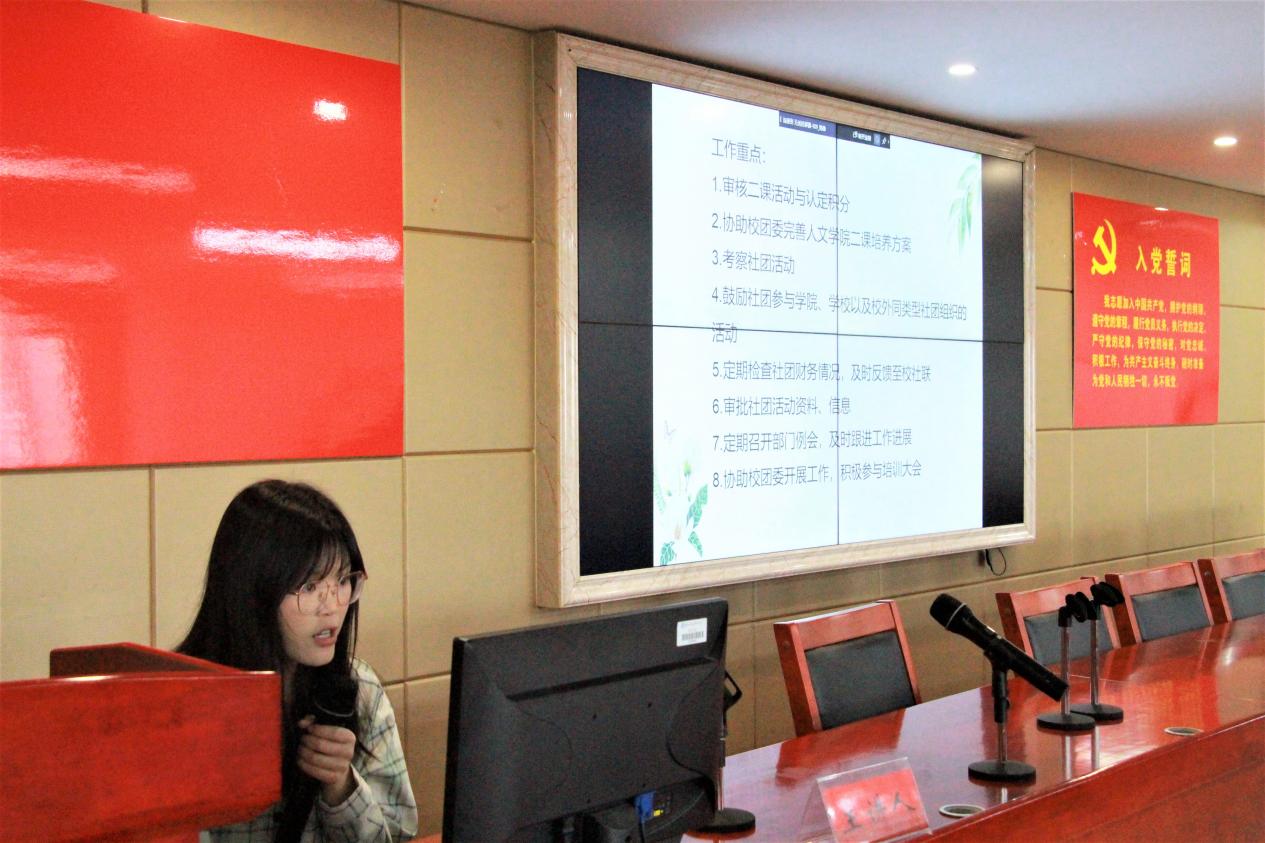 会上,各部门按照顺序依次上台进行汇报。参与述职的18名部长简要介绍了部门主要职能,展示了部门具体工作内容、取得的成绩和存在的问题,并就今后工作的开展方向做了规划,各班员工代表和与会老师根据部长的汇报情况对各部门进行打分考评。