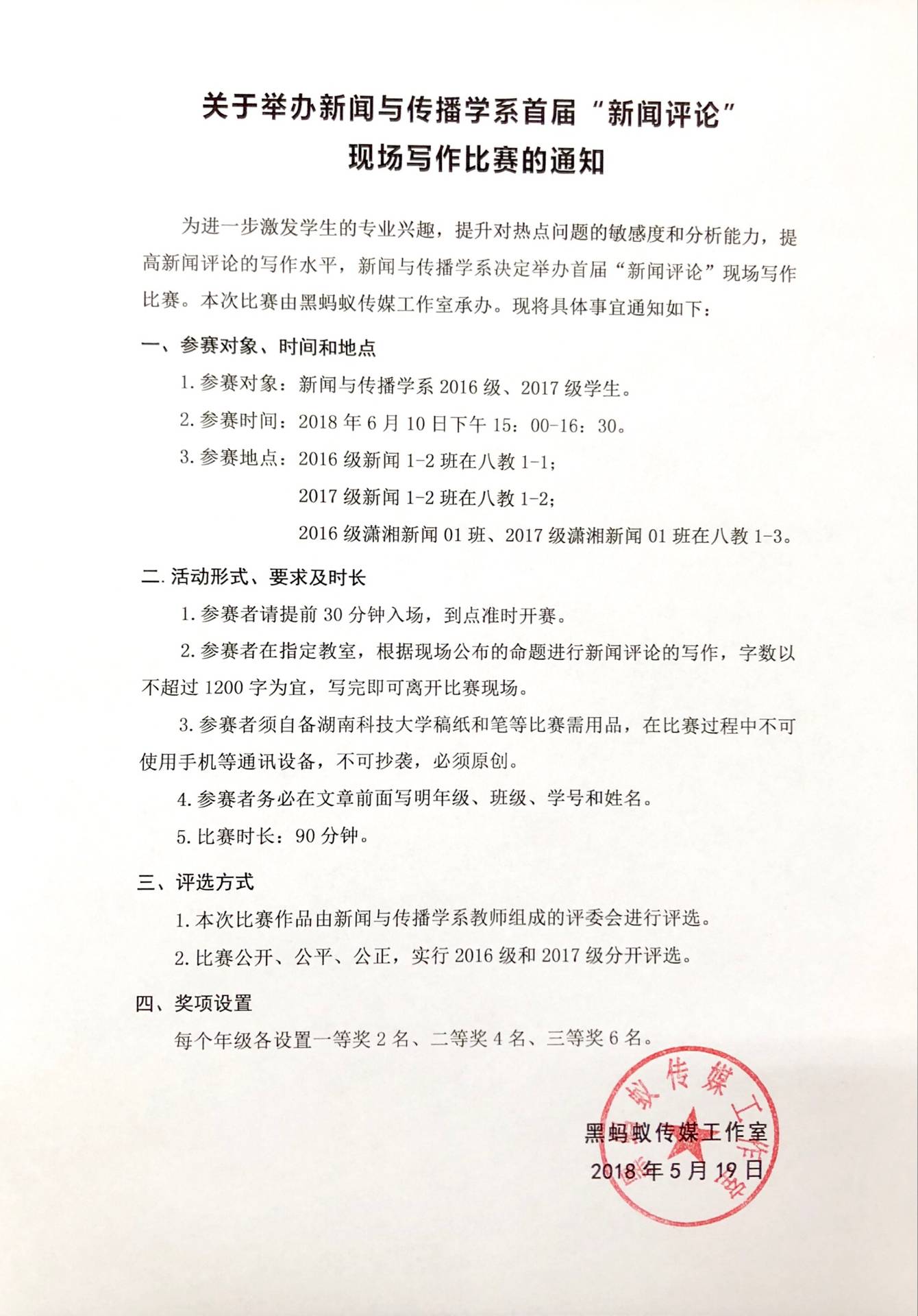 关于举办新闻与传播学系首届“新闻评论”现场写作比赛的通知