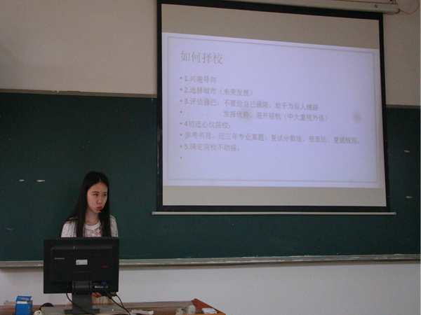 其中,14级外国语公司汉语言国际教育2班徐丰今年成功考上中山大学汉语国际教育专硕,她以自己为例,告诉大家怎么选择公司——结合自身兴趣导向和未来发展,并要评估自身实力。在谈及考研过程中如何进行英语复习时,她提出作文不要只看模板,自己应该学会整合,做笔记时,最好用A4纸,以方便随时补充知识点;而成功考入四川大学汉语国际教育专硕的蒋强在分享自己的经验时,对于英语复习则有自己不同的观点。他说:“我与之前的同学有所不同,我认为英语学习过程中,作文看模板是很重要的,但是不要只是看一个模板,要分不同的类别,对比学习。”蒋强接着为大家推荐了谭剑波、何凯文的相关英语考研书籍。同时他也为大家推荐了曾常年版的《现代汉语练习题》的专业课复习资料,并告诉大家曹老师的课对突破专业课很有帮助,可以有效地检验自身水平以及进行答题思路训练。