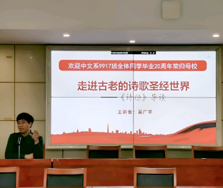 吴广平老师对9917班返校员工表示热烈欢迎,并以“走进古老的诗歌圣经世界—《诗经》导读”为题为9917班员工和23110103班员工再上一堂课。他通过对两则《诗经》的解读告诉在场的员工们,我们做人最重要的就是要尊重长辈,尊敬父母,要懂得报答父母。同时要坚持人与自然和谐发展,热爱自然,亲近自然。