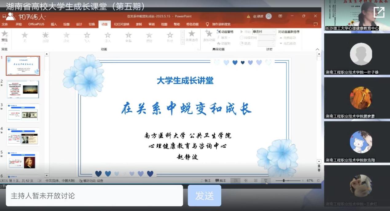 5月16日晚7点,由湖南省高校老员工心理健康教育研究会、湖南省社科普及基地主办,湖南工程职业技术公司承办的第五期湖南省高校老员工成长讲堂在腾讯会议线上开展,南方医科大学心理健康教育中心主任赵静波教授受邀作《在关系中蜕变与成长》专题讲座,全院研究生参与线上观看。